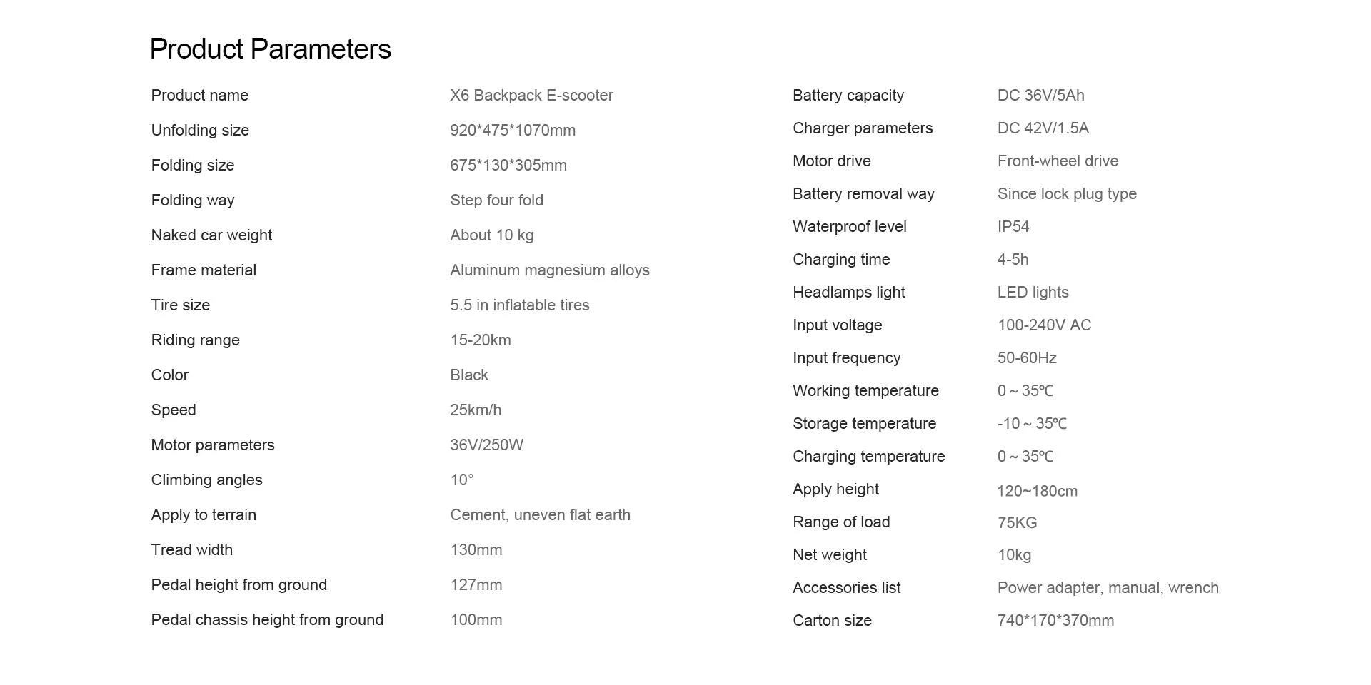 - Charging: 90-240V AC input, with a 42V/2A charger (84W); charging time 6–8 hours.