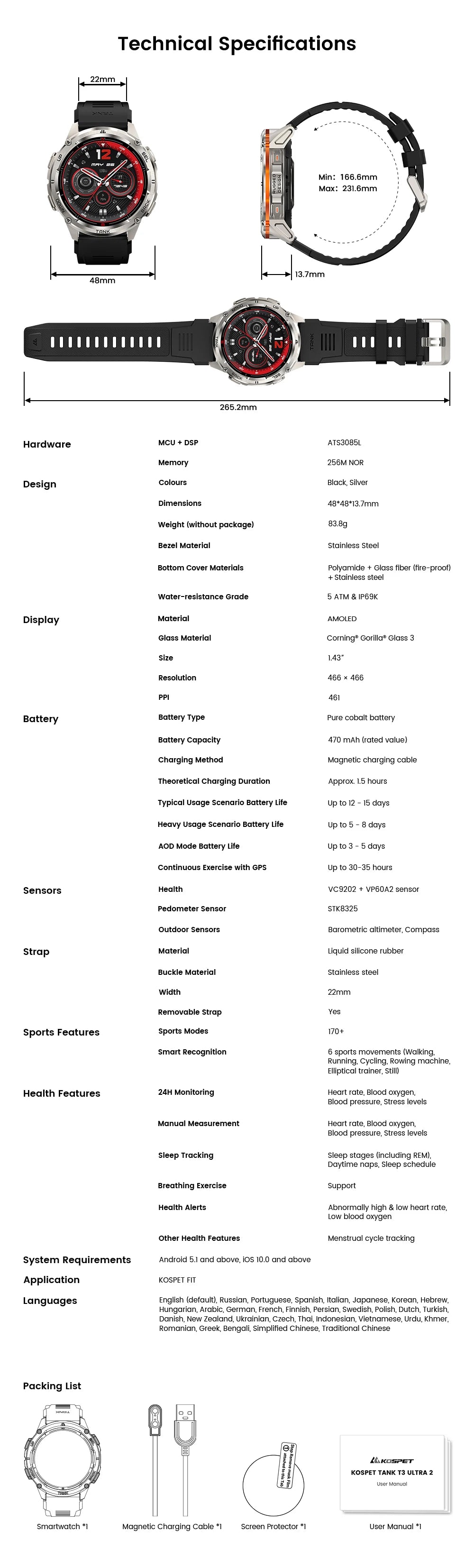 Meet the KOSPET Tank T3 Ultra 2 GPS Smart Watch Compass Altimeter — a rugged, premium wearable designed for outdoor adventures and everyday life. Built with a full metal body, MIL-STD-810H certification, and a stunning 1.43" AMOLED always-on display, this watch pairs rugged durability with elite navigation and health tracking.