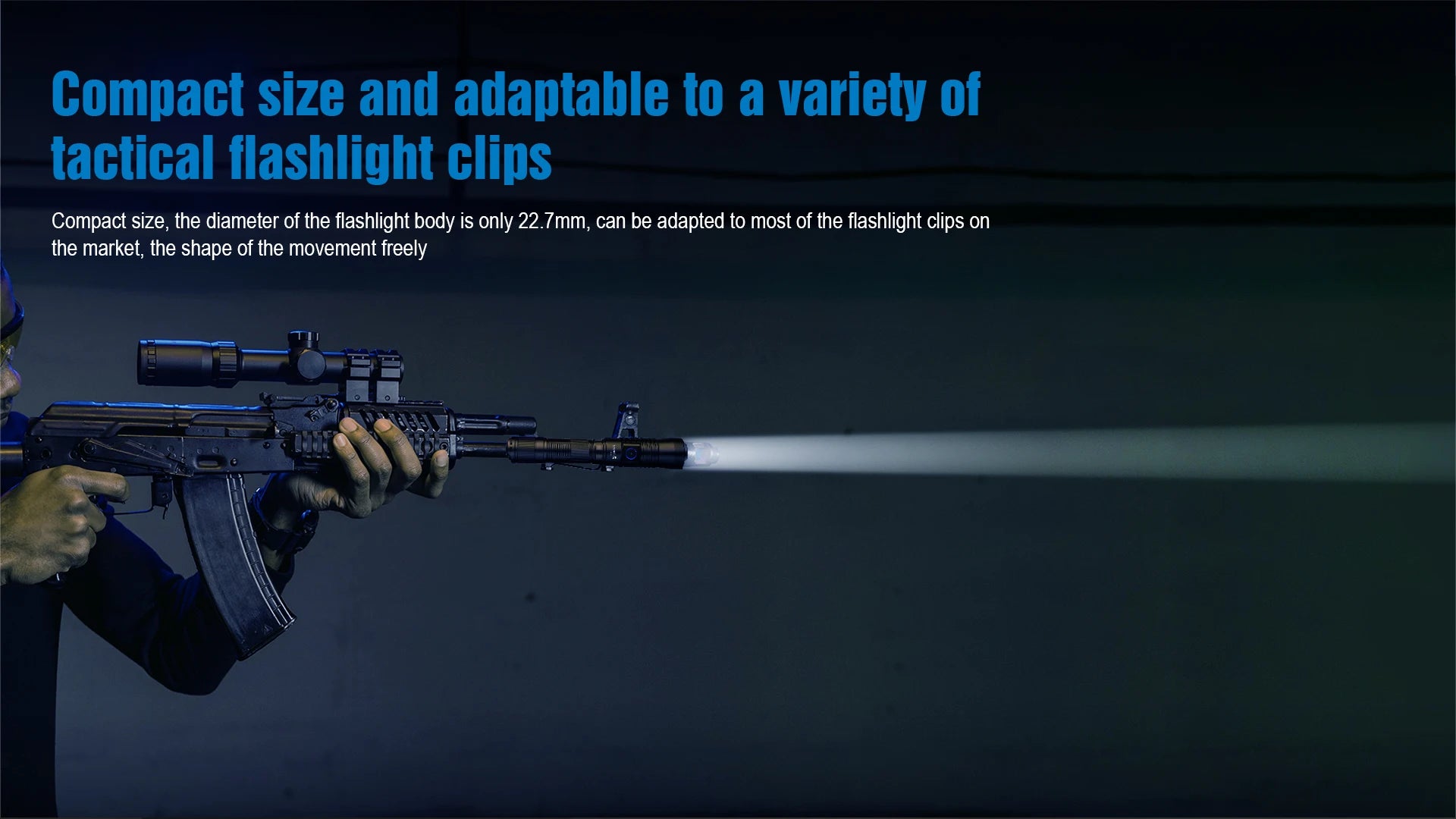 - Compact design with a body diameter of only 22.7 mm, compatible with most tactical clips