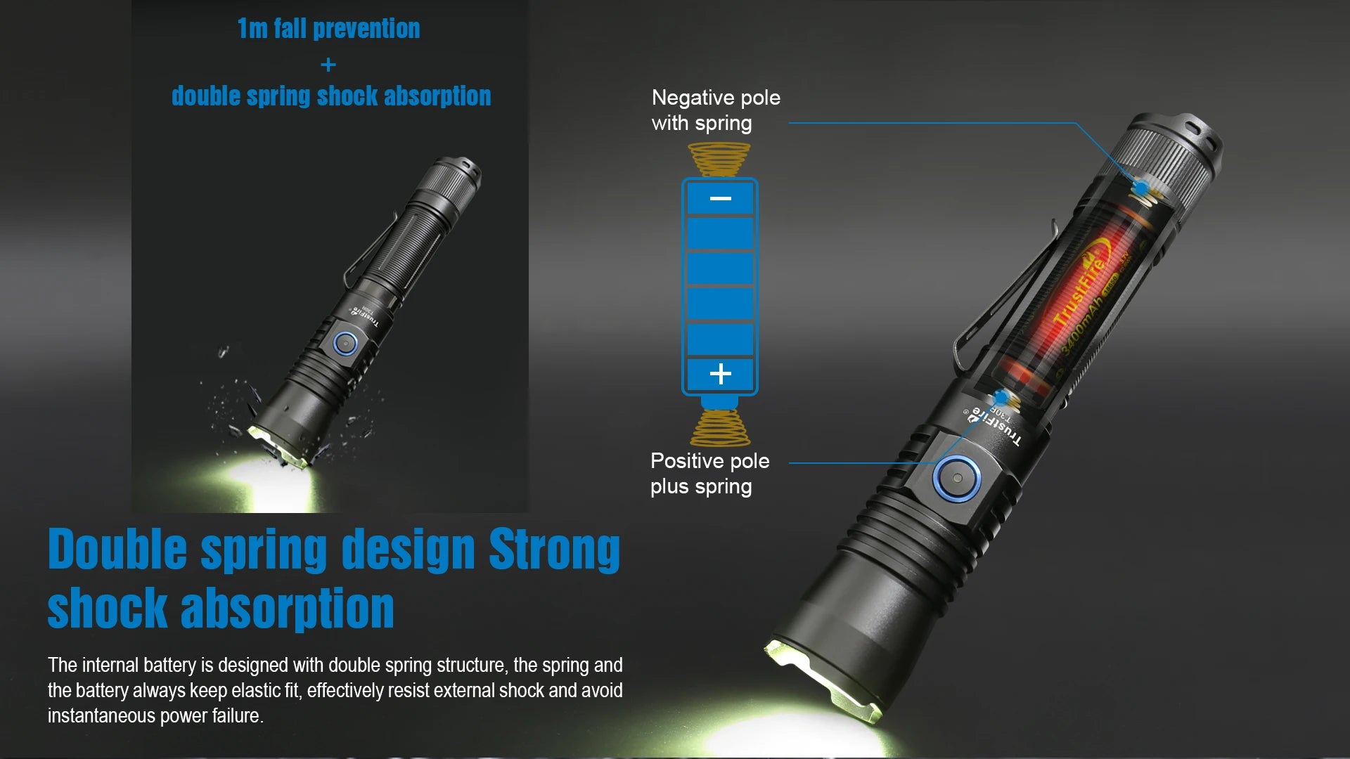 - Dual-spring shock absorption plus a 1-meter drop resistance to protect the internal battery from bumps