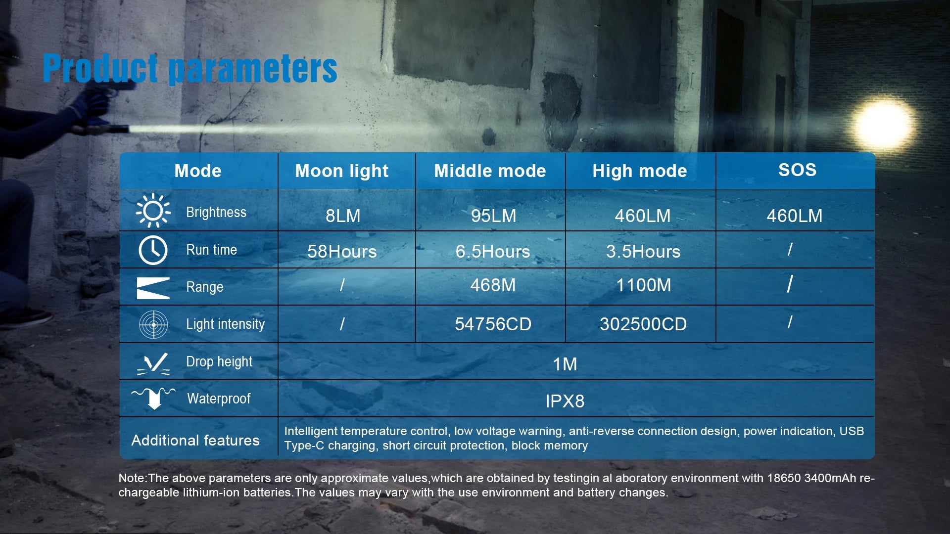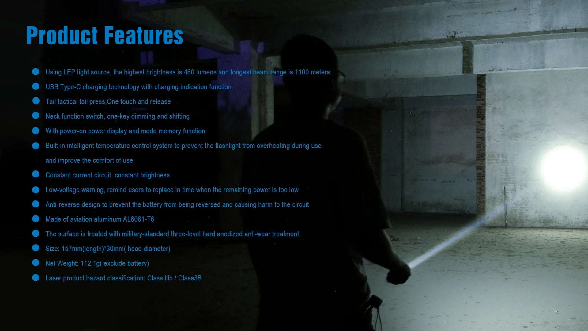 - 460 lumens maximum brightness with a tight long-range spot