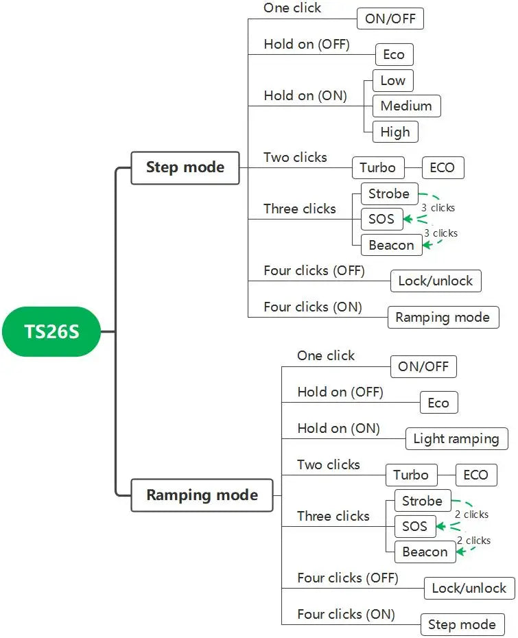 - Operational Modes: Two group modes (Stepped and Ramp) controlled by a single side switch for easy one-handed use