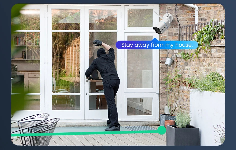 - Light & Siren deterrence — Built-in lighting and a siren provide a proactive defense to deter intruders before they reach your property.