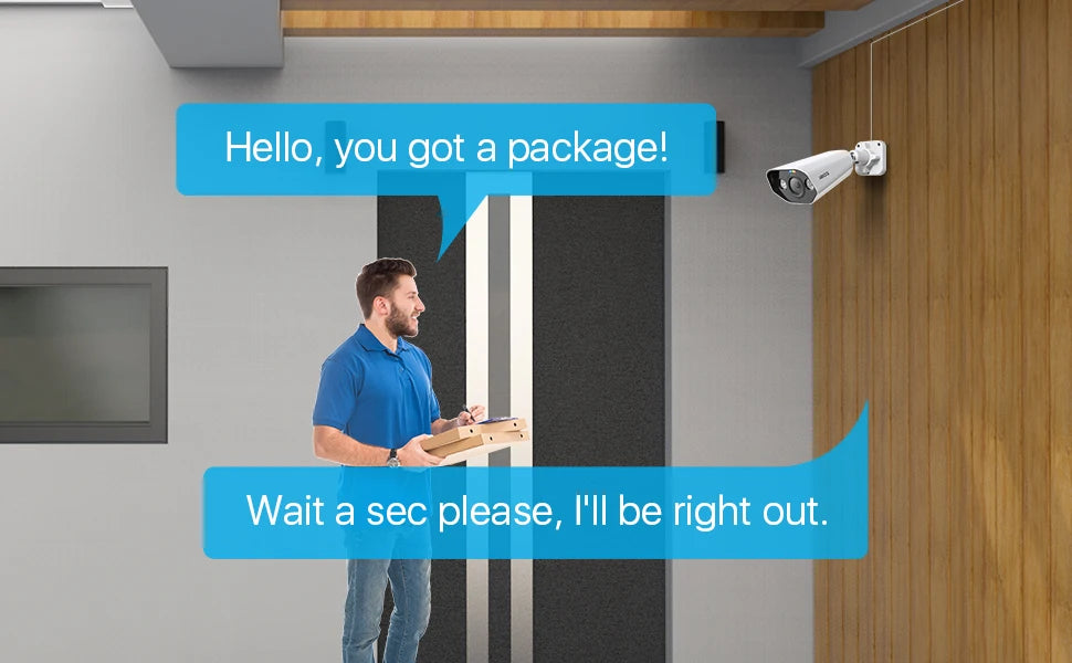 - Two-Way Audio: Listen and speak directly through the cameras to communicate with visitors, delivery personnel, or intruders from your phone.